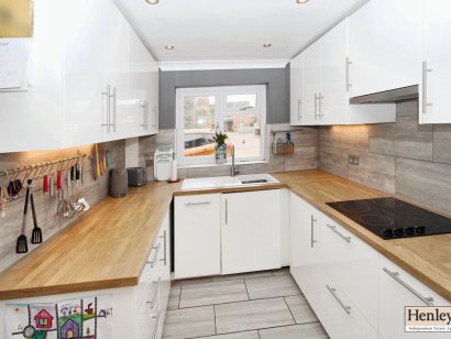 KITCHEN Tiled flooring, gloss finish base and eye level units, wood effect work surface, ceramic hob, extractor, double oven, tiled splash back, sink with mixer tap, window to front.