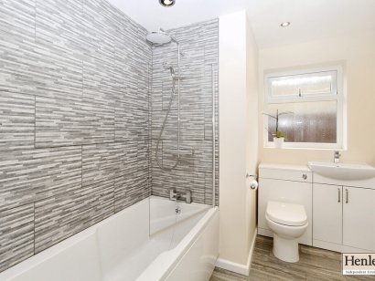 BATHROOM Tiled flooring, bath with shower over and shower screen, tiled splash back, toilet, sink with vanity unit, heated towel rail, window to side.