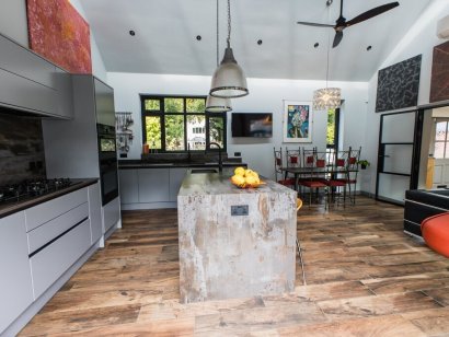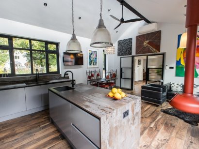 KITCHEN Modern extension with tiled floor, central island and French doors onto the patio, there is also a floating log burner and fitted units with built in appliances.