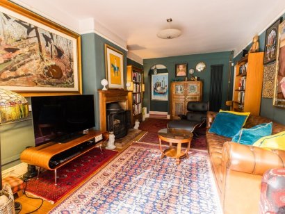 LIVING ROOM Open with fireplace with oak surround and wood burning stove, exposed timber floorboards and colonial picture rail.